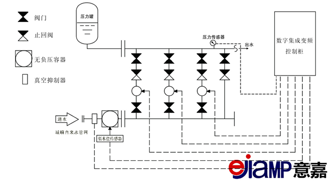 意嘉EJGW無(wú)負(fù)壓供水設(shè)備又稱之為疊壓供水設(shè)備,是以自來水為水源,充分利用自來水管網(wǎng)本身壓力,實(shí)現(xiàn)“差多少,補(bǔ)多少”的連續(xù)增壓的供水方式。在設(shè)備入口管道上串接一個(gè)壓力罐,對(duì)市政管網(wǎng)起到緩沖補(bǔ)償作用,并用以防止產(chǎn)生負(fù)壓,從而防止對(duì)市政管網(wǎng)造成過度抽吸。