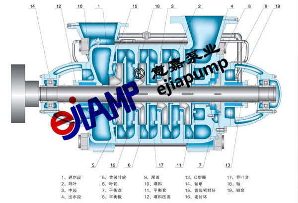 2、D型臥式多級離心泵主要零件有:進水段、中段、出水段、葉輪、導翼擋板、出水段導翼、軸、密封環(huán)、平衡環(huán)、軸套、尾蓋及軸承體。