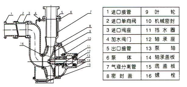 ZW系列自吸式無堵塞排污泵主要由泵體,葉輪,后蓋,機械密封,泵軸,軸承座,進氣閥,氣液分離管,加水閥,進排氣管組成。泵的結構如下圖所示。