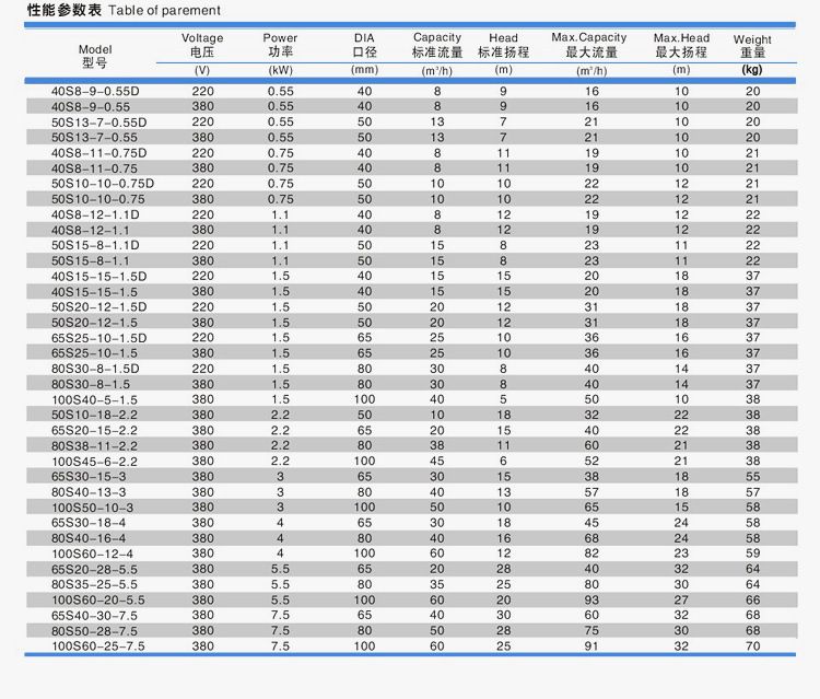 型號 | 電壓 | 功率 | 出口 | 標準流量 | 標準揚程 | 最大流量 | 最大揚程 | 重量 |