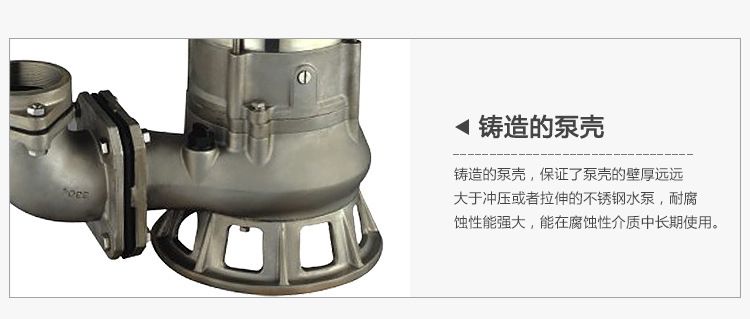 不銹鋼排污泵是電機與水泵同軸一體潛入介質(zhì)中工作的水利機械整體機殼采用不銹鋼材質(zhì),耐腐蝕性強、選材精良、結(jié)構(gòu)先進、過流通道寬闊、排污能力強。適用于輸送含有酸堿成分的污水,例如樓房廢水、化工廠污水、食品廠、海水處理等等。