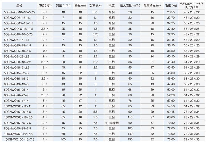 GNWQ污水切割排污泵性能參數(shù)表: