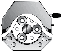 鏈條傳動軟管泵一根內(nèi)壁光滑、強度可靠的特制橡膠軟管安裝在泵內(nèi)部,通過一對壓輥沿著橡膠軟管旋轉(zhuǎn)擠壓,將膠管壓扁,這樣的旋轉(zhuǎn)使得介質(zhì)往一個方向輸送,而不會有倒流,軟管在輸送介質(zhì)之后,在被壓扁軟管的自身彈性和側(cè)導輥的強制力下,使軟管恢復原狀,此時,軟管內(nèi)產(chǎn)生高真空將介質(zhì)再次吸入管腔;然后介質(zhì)在隨之而來的壓輥擠壓下從管內(nèi)排出。如此周而始,介質(zhì)不斷地被吸入和排出。