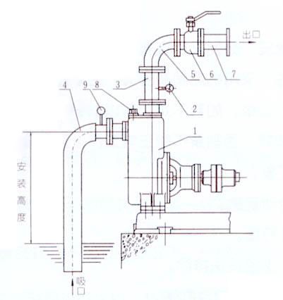 1.泵 2.壓力表 3.出口垂管 4.吸入硬喉管 5.彎頭 6.流量控制閥 7.出口管路 8.加液螺塞 9.真空表